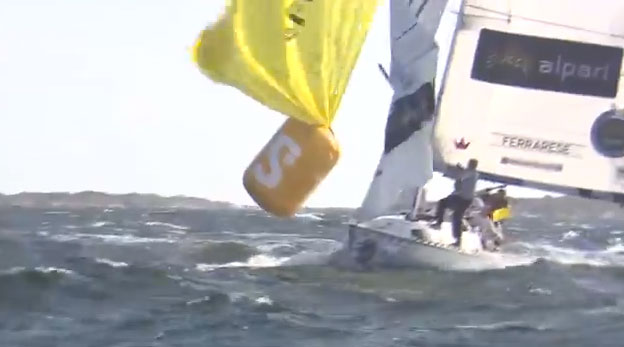 In the first broach, the crew should have released the boom vang (or kicking strap) and also the halyard at the top of the spinnaker. Often this is the only way to dump the power from the huge out-of-control sail off the bow of the boat.