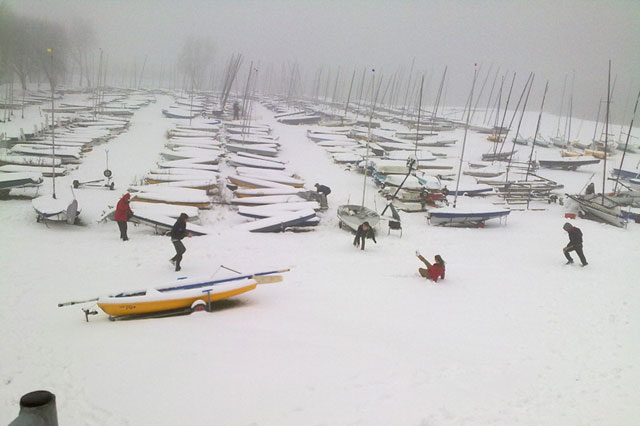 That evening the snow started to fall, but sailors still enjoyed a two-course dinner at the club before heading off into the freezing night. Two sailors left it a bit late leaving a pub, however, and had to stay put for the night, only being delivered back to the hotel they had paid for in Oakham the following morning when a farmer drove them back into town on his tractor.